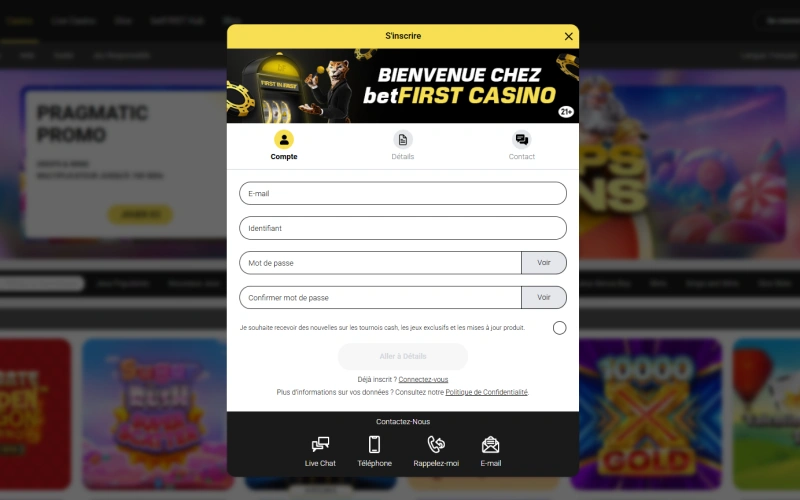 - Rendez-vous sur le site officiel de BetFIRST casino inscription et cliquez sur le bouton “S’inscrire”